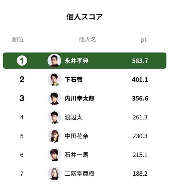 個人トップをひた走る永井は、2位の下石戟に180ポイント余りの差をつけている。