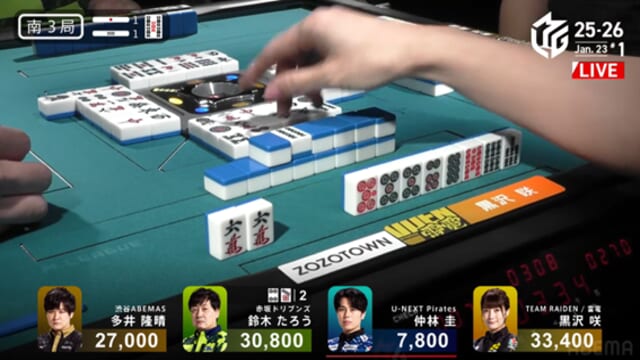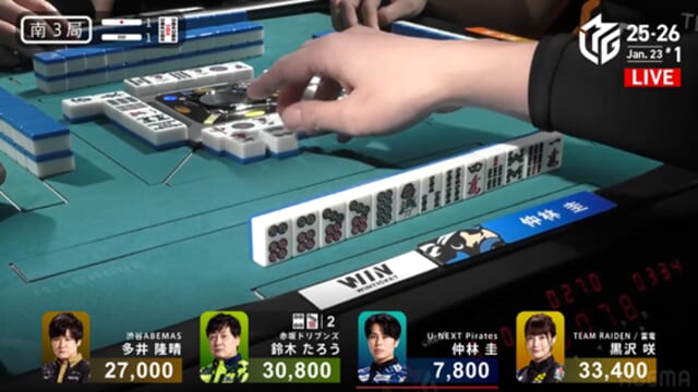 迎えたオーラス。黒沢はかなり厳しい配牌から、鳴き仕掛けを入れて連荘を目指す。すると、2段目中盤で仲林が![]()