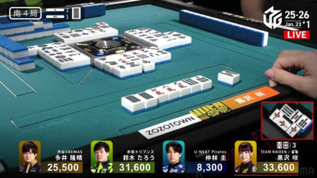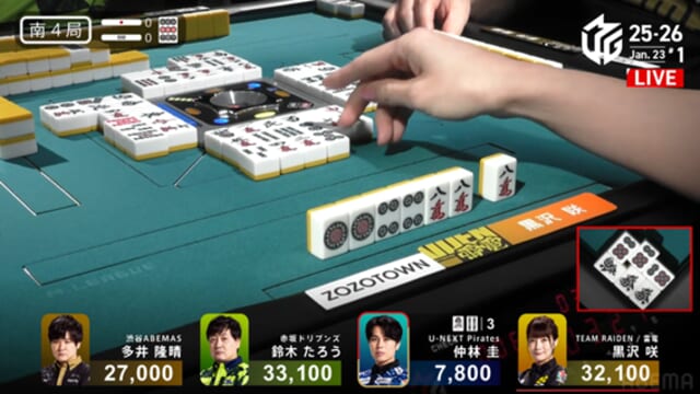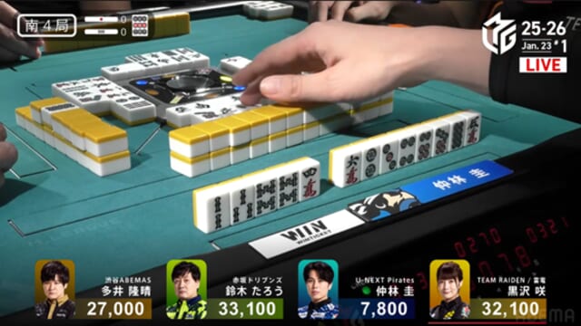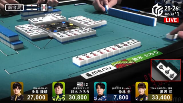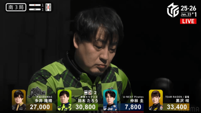 すると、次局の1本場ではドラドラの手牌を生かして2000は2100オール。再びたろうを逆転し、そのままトップを獲得した。