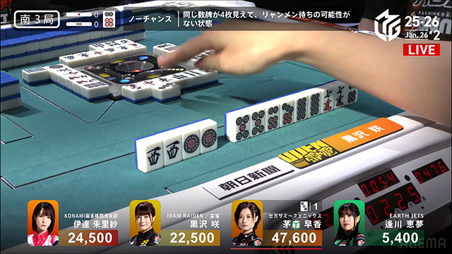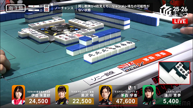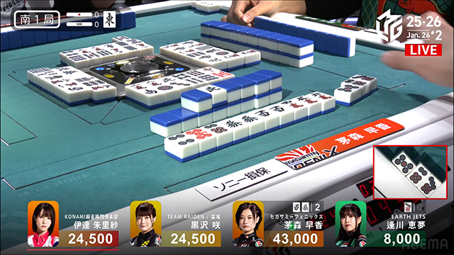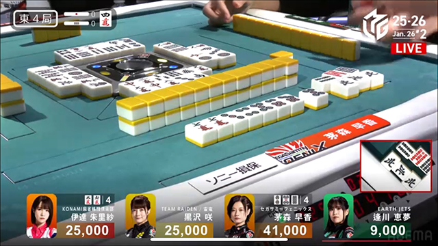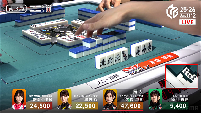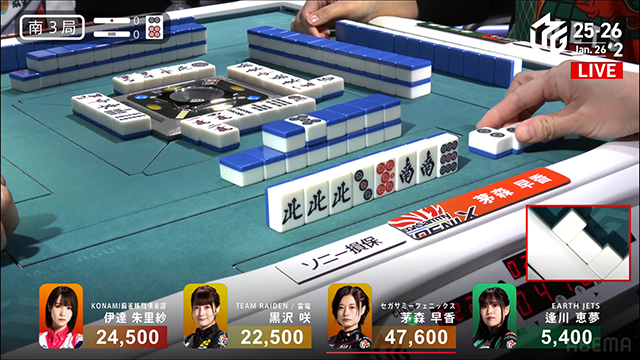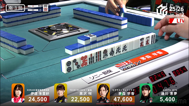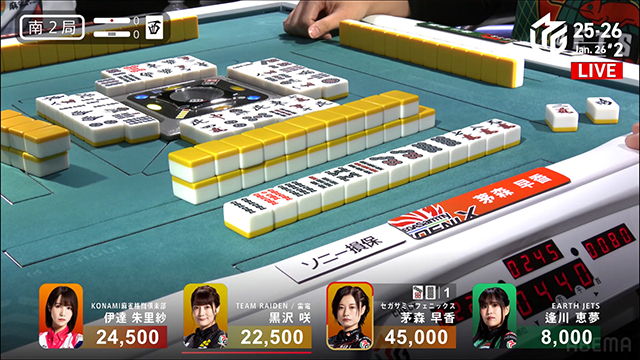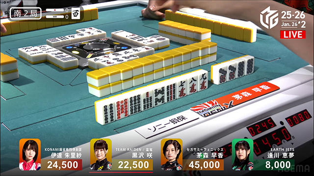 南3局1本場も赤3ドラ1のゴキゲンな親リーチを入れるが、先にテンパイしていた伊達が逢川のリーチ宣言牌を捉え3900のアガリ。