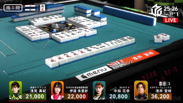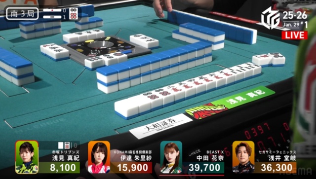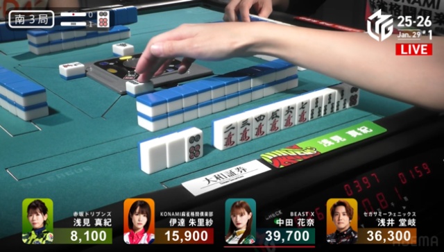 「今日の主役は俺だ」と堂岐も負けじと混一色・七対子のイーシャンテンから
