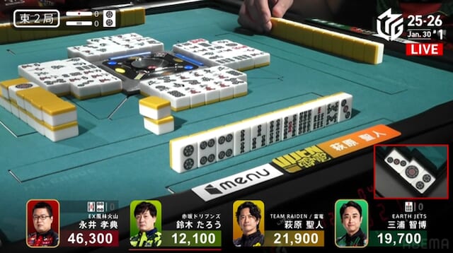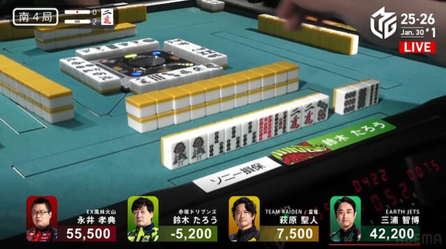 が永井への放銃となった。リーチ・タンヤオ・赤の5200点。 永井の積極的なリーチ判断が、またもや結果に直結した。