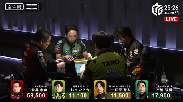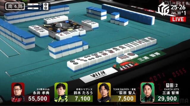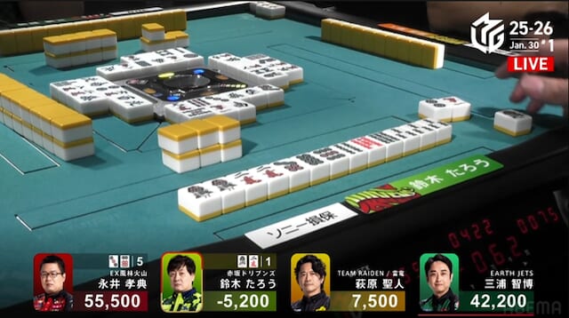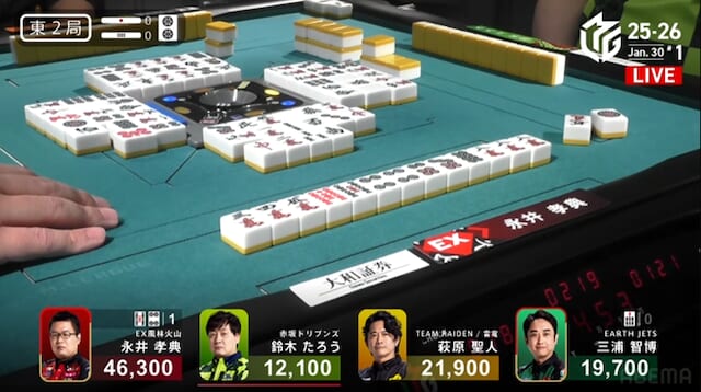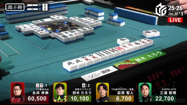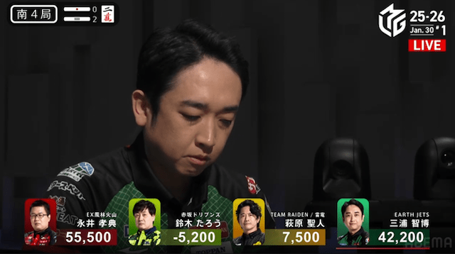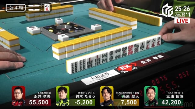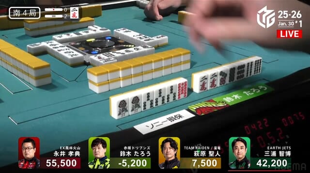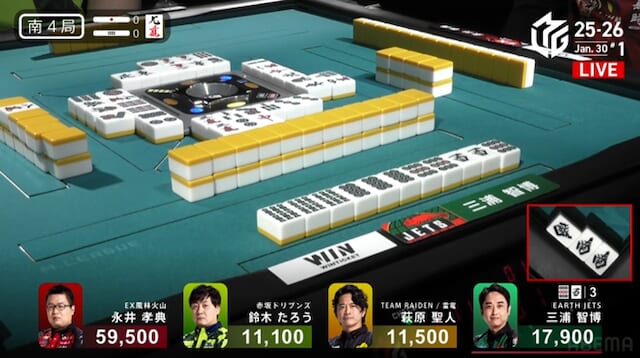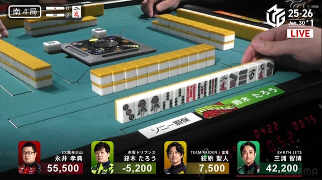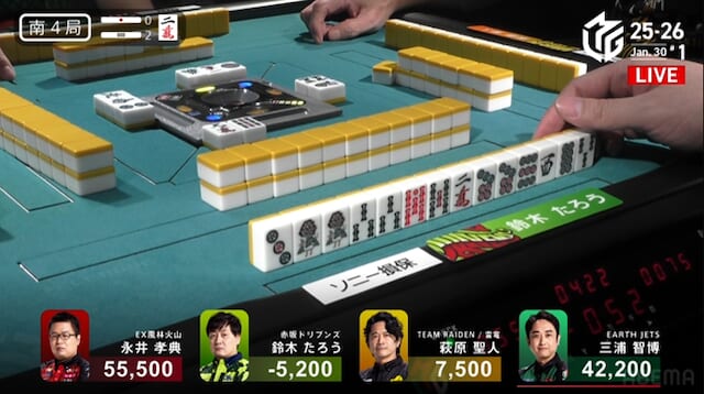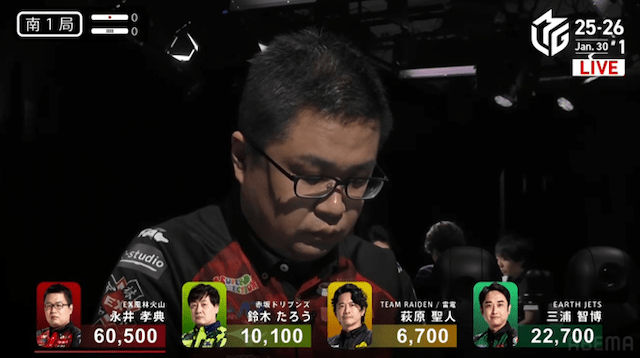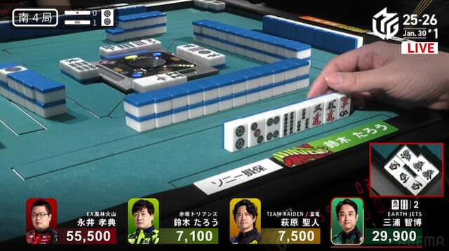 続く南3局では、三浦が萩原から3200点を直撃。南場に入ってから2着争いはめまぐるしく入れ替わり、誰が抜け出すか読めない展開が続く。