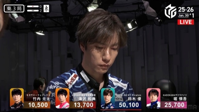1戦前は南3局でトップ目のポジションから瀬戸熊直樹への痛恨の放銃により4着へ真っ逆さま。