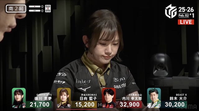 日向はいつも通りやっていた感じだけど、仕掛けてリーチが入って押さざるを得ない牌が当たり牌につながる感じでした。ただ、日向さんがここでラスを引いてしまったので、ボーダー争いはABEMASもちょっと危なくなってきたかなと思わせる1回戦ではありました。