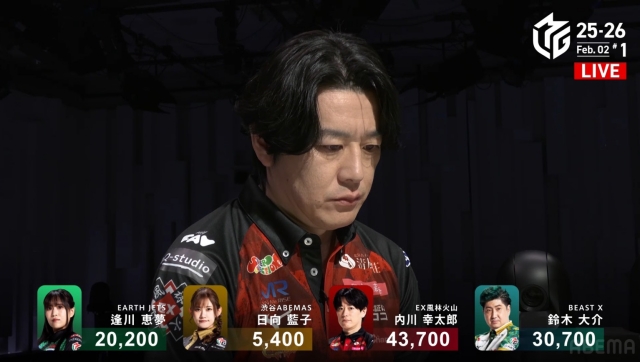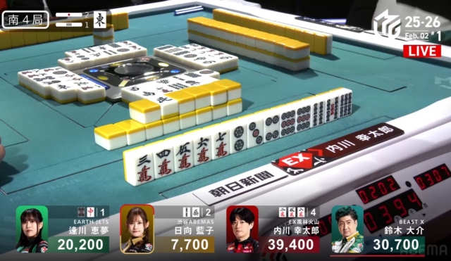 内川と同様、2着の大介も3着の逢川と8300点以上離れているため、放銃覚悟で攻めてくる可能性が高い。