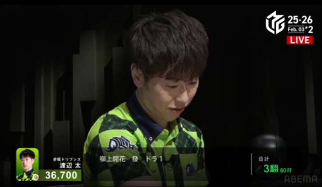 渋川への6400放銃と前局の太への2000点を帳消しにするアガりを決め、ハイペースで東場が終了。