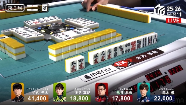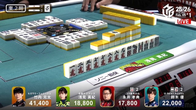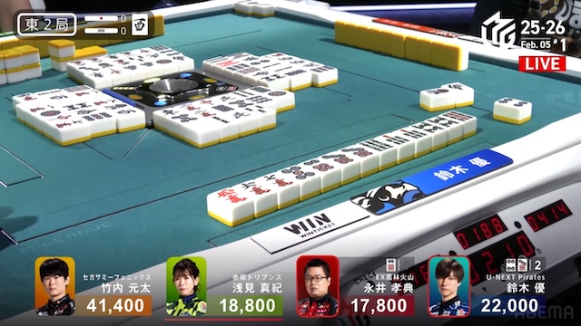 点棒状況を見ると、元太が41400点持ちのトップ目。優が2着で22000点。フェニックスはチーム順位4位、+184.9ポイントと比較的余裕のある位置におり、優勝を目指す立場としては、取れるトップは確実に取りたい局面でもある。