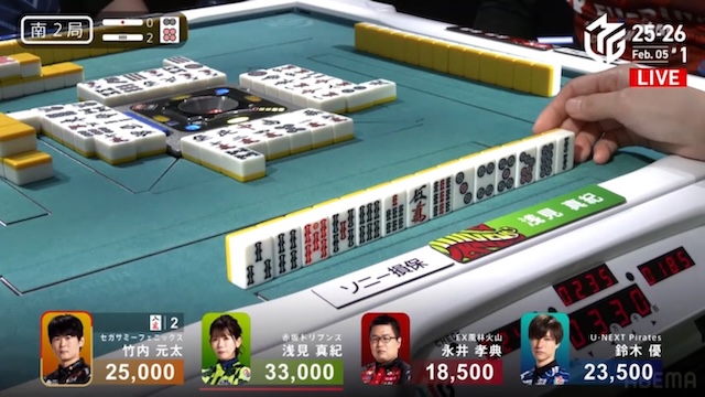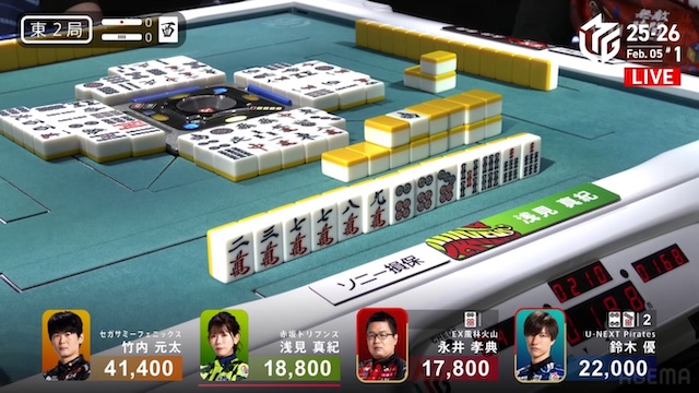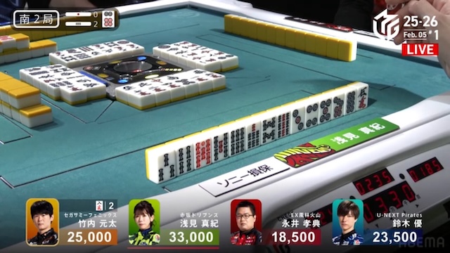浅見は親番で6000オール、さらに1300は1400オールと連続で加点し、一気にトップ目へ浮上する。