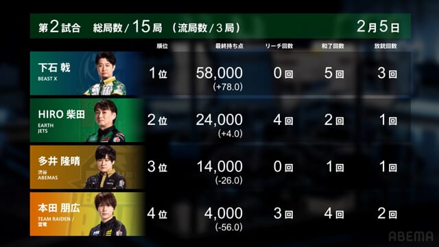 トップを取った下石の「そこから鳴くの?!」という混一色の仕上げっぷりには2回驚かされた。