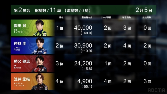 この半荘は園田がトップ。