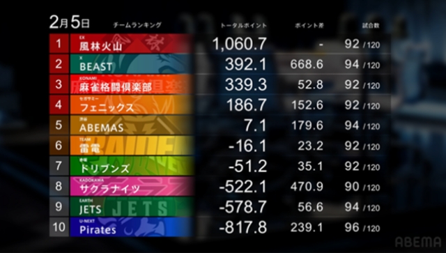 前日の対局を経て、チームランキングは大きく動いた。