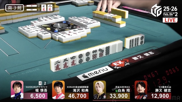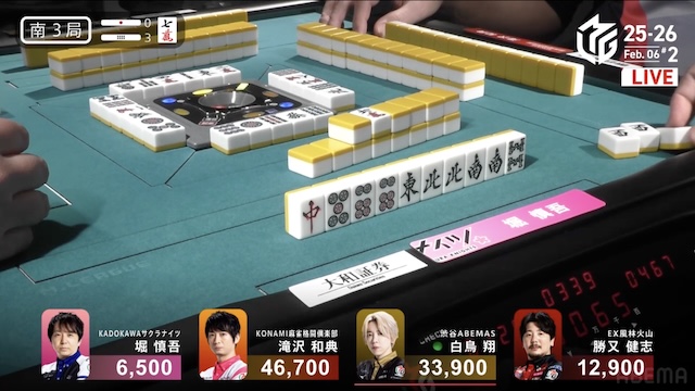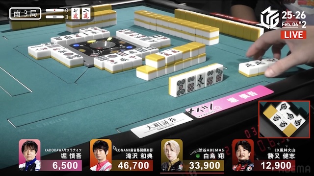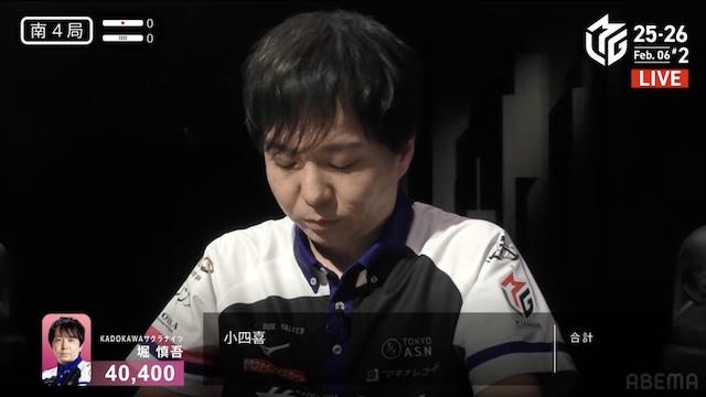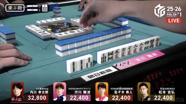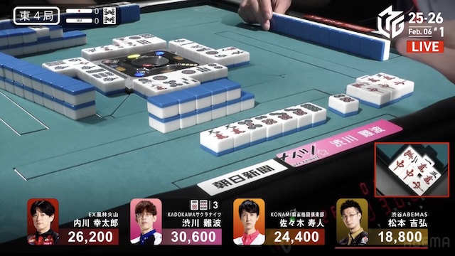 そのあと、東4局も渋川君が仕掛けて300-500をアガるんですけど、前局のアガリでトップ目に立ったんだから、もう少しどっしり構えてもよかったんじゃないかな、とは思いました。トップ目から門前でリーチが来たら周りも引いたりすることがあると思いますし、サクラナイツはチーム状況的にトップが欲しい立場だったと思いますけど、まだ東場でしたし、トップ目の段階ではもう少し余裕を持って、場況を見ながら点数を稼ぎに行く手もあったのかなって。もちろん、あのアガリ自体を否定するつもりは全くないですけど、ここを安くアガったことで「南場でもつれるんじゃないかな」という印象を持ちました。