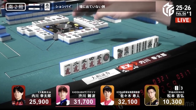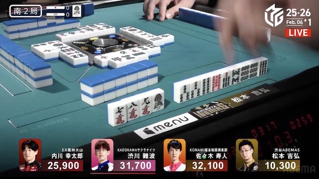 が生牌とは言え、三色1シャンテンだったらそれくらいは行くのかなと思ったんですけどね。あそこでオリに向かったのはチームの成績を考えてのことなのかなと思いました。風林火山は現状1位ですし、内川君自体もあそこで松本君に放銃すると自分がラス目になるかもということで、控えたんだと思います。シーズンの初期なら勝負していたかもしれないですね。