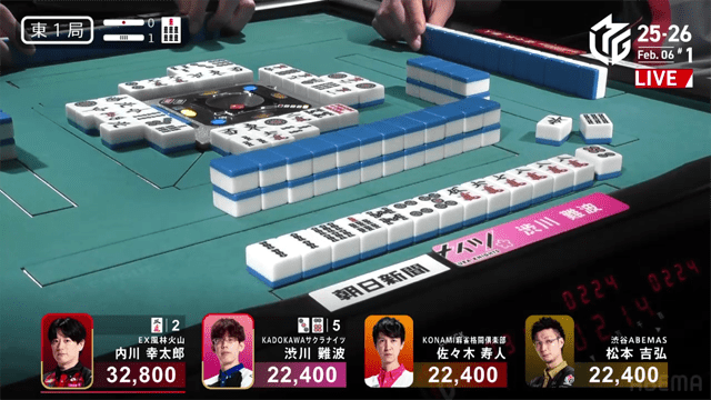 東1局は、起家の内川がリーチピンフをツモアガリ。