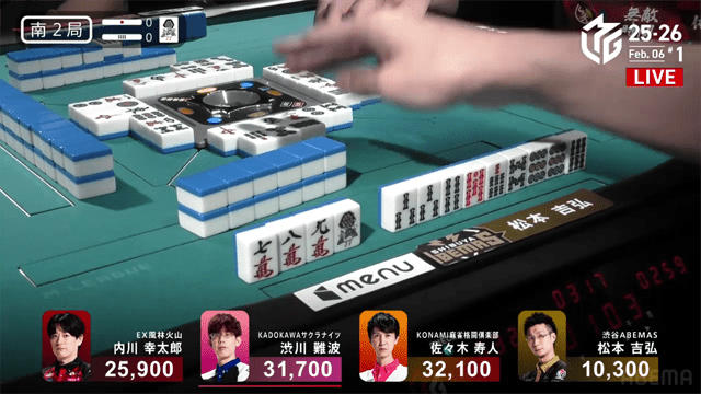 これまで苦しい展開が続いていたラス目の松本が、中盤に先制リーチを打つ。