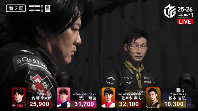 内川とのリーチ合戦を制し、リーチ一発ツモタンヤオ、2100・4100のアガリとなった。