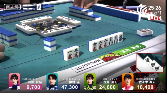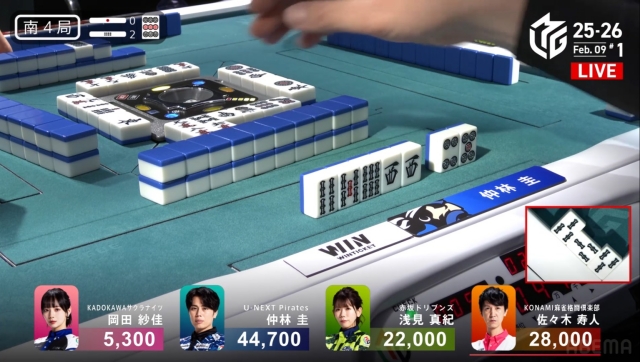 続く1本場でも仕掛けての1500で親番続行で南4局は2本場へ。
