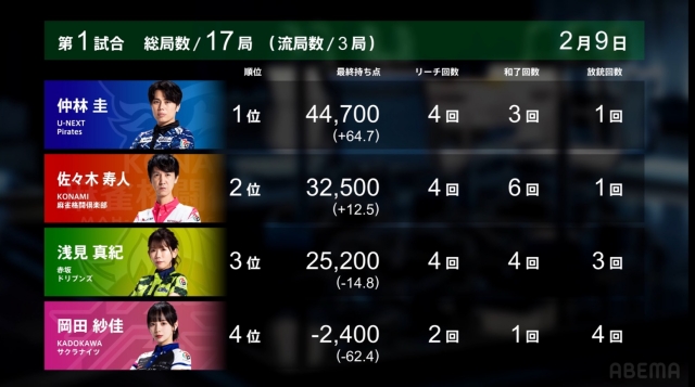 最後の最後は4人テンパイを浅見が制して長いオーラスが決着。