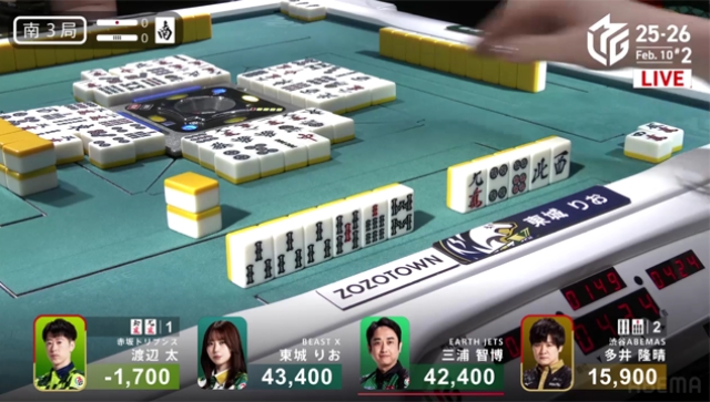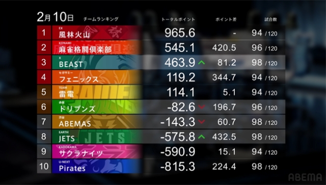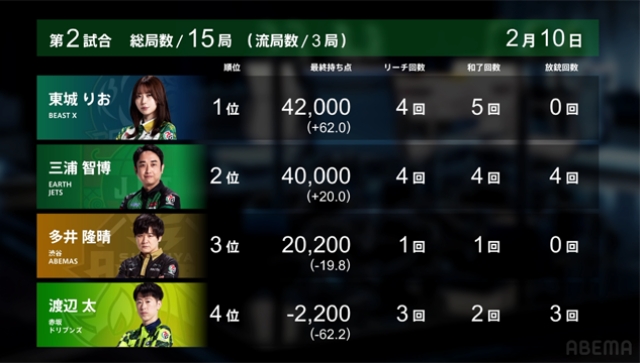 第1試合の下石戟に続く同日連勝で、BEAST Ⅹは2位の麻雀格闘倶楽部とのポイント差がぐっと縮まった。