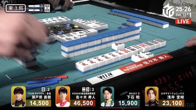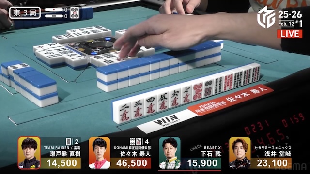 は切らないからというので次巡にツモ切りリーチをしたら、瀬戸熊君が一発でつかんじゃったんですね。こういうところからも、瀬戸熊君にとっては辛い1日でしたね。