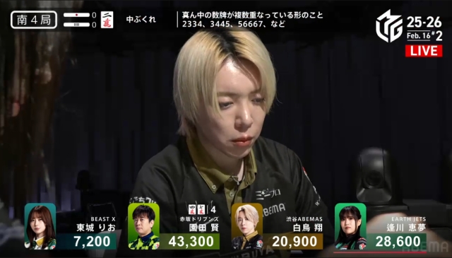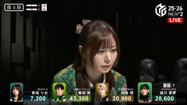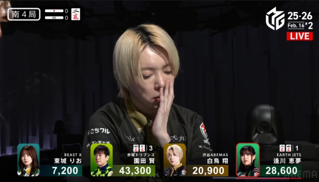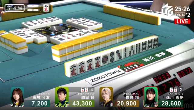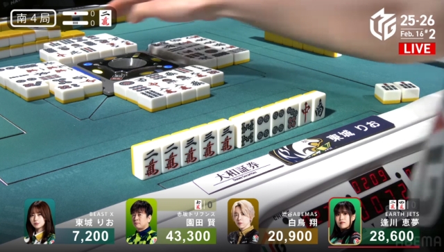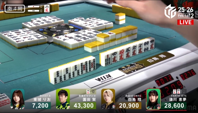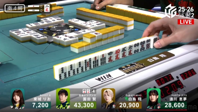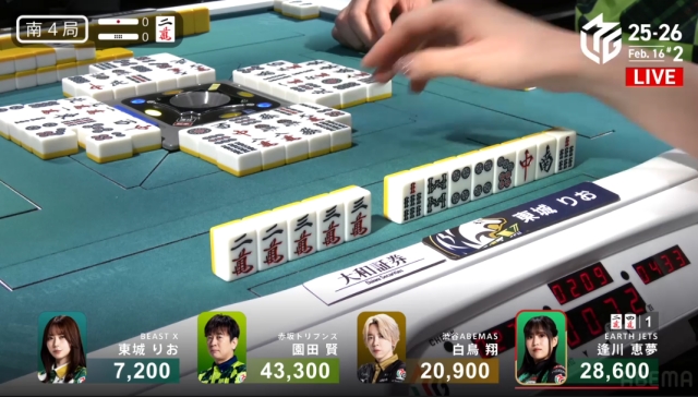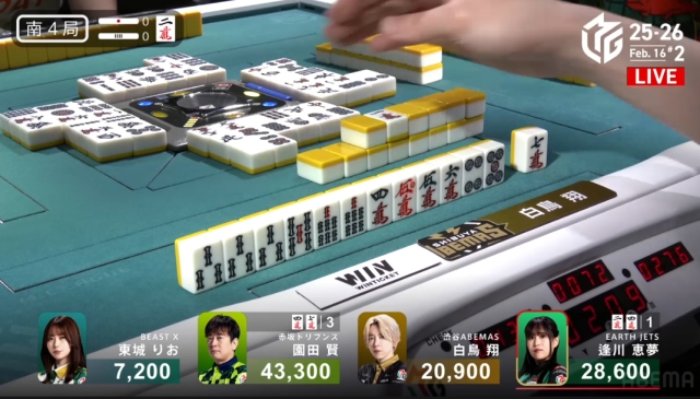 を掴んで撤退。これでこの局は逢川が和了るか流局かに見えたが……