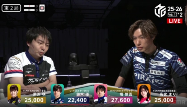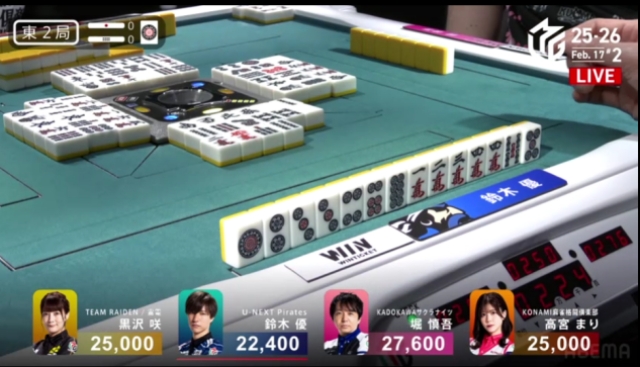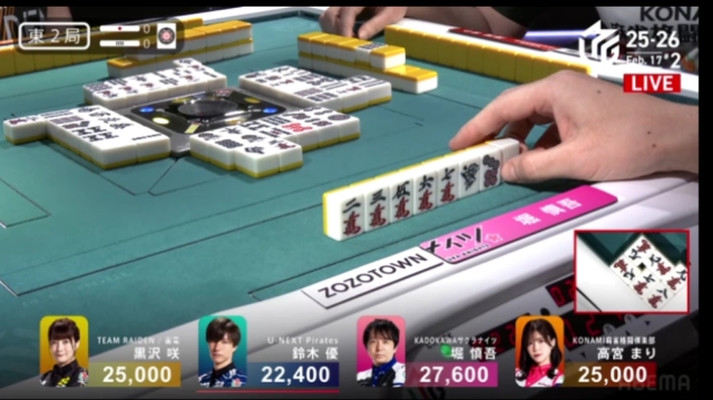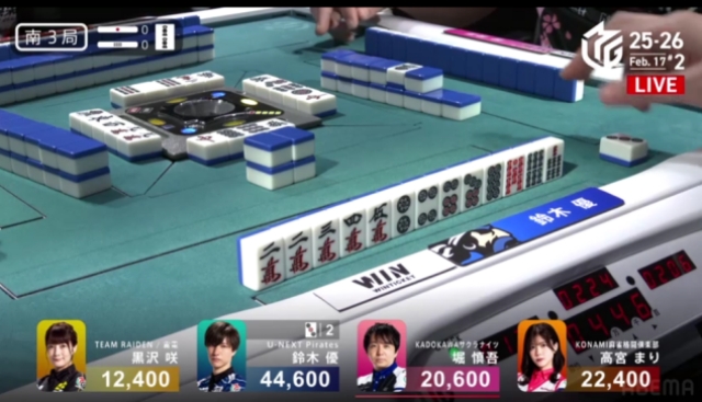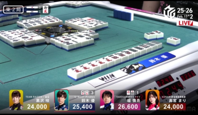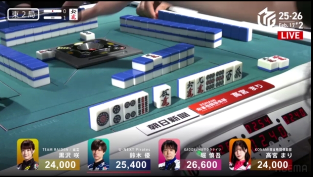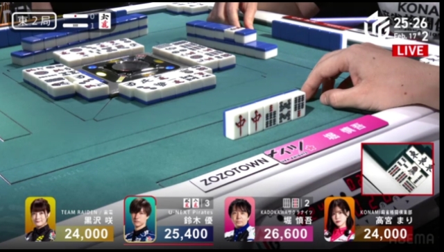 1巡の後先で堀は優からの3900のロン牌を逃す。