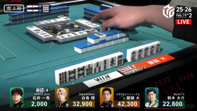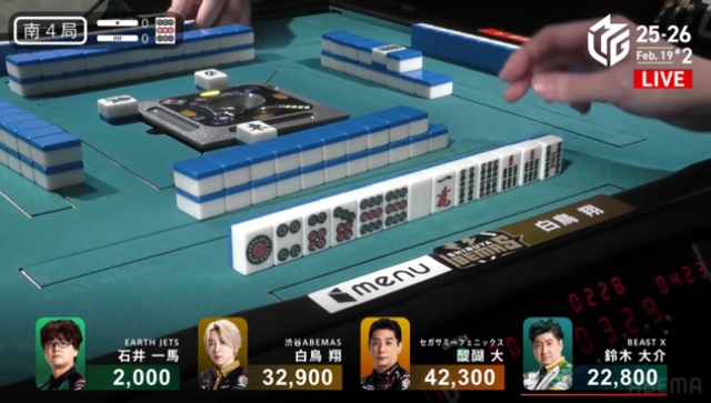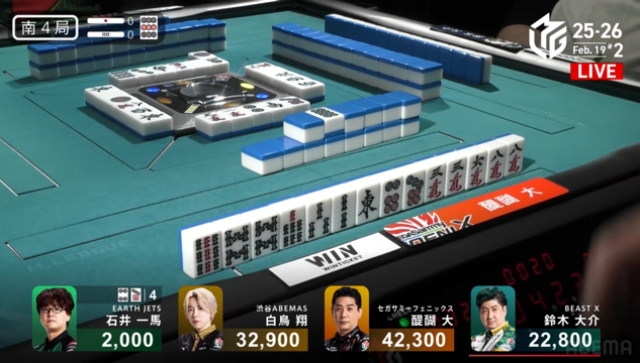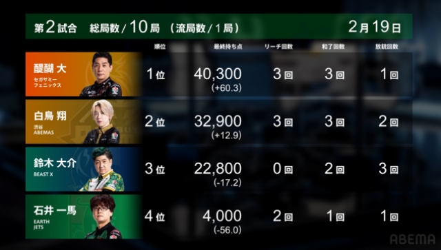 放銃1回でまさかの4000点の一馬が4着という結果になったが、ABEMASのトップを阻止することに成功した。