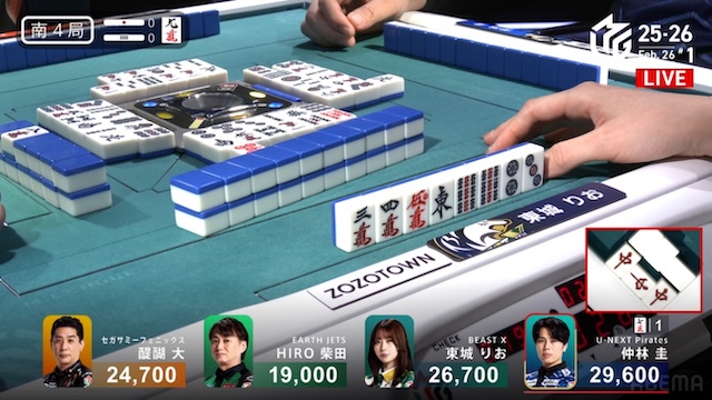 トップ目の仲林は29600点持ち。2着の東城26700点持ちで、追いかける立場だ。