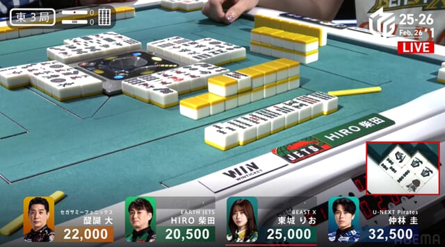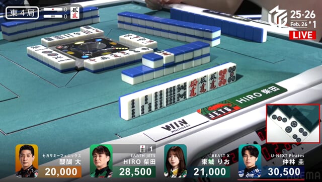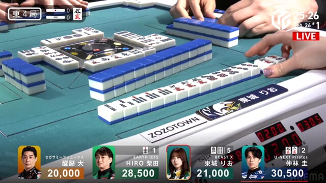 続く東4局に柴田君がタンヤオドラ5のテンパイを入れるも、結果は東城さんのリーチ一発目に当たり牌を持ってきてマンガンの放銃。このハネマンがアガれていればこの試合結果も変わったのかなと思う。