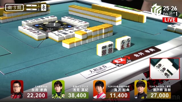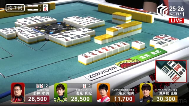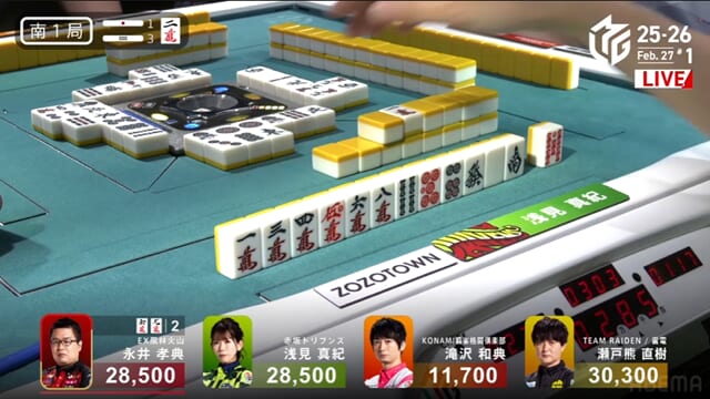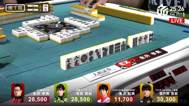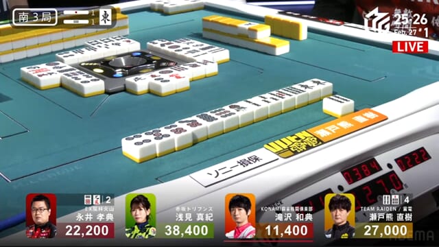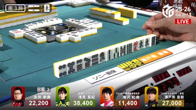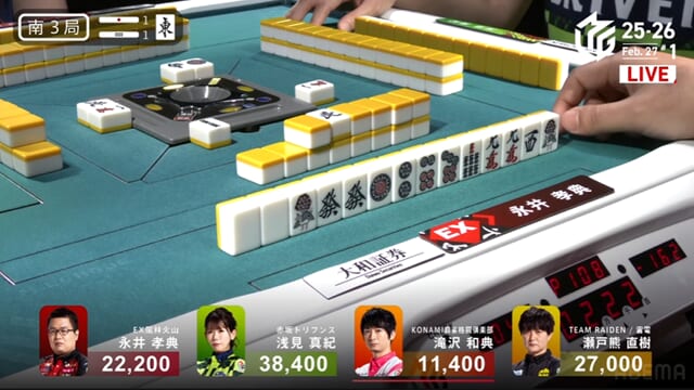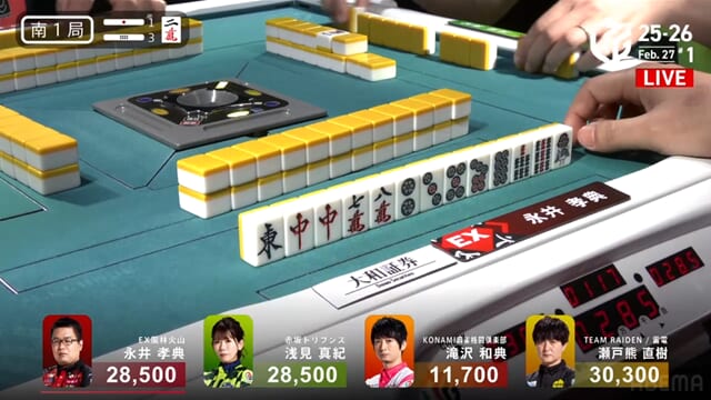 東場はリーチの応酬こそあったものの、裏ドラに恵まれず、大きなアガリには至らなかった。 そんな中、東4局でリーチのぶつかり合いで瀬戸熊に5800を放銃した滝沢が一人沈み、他の3人が横一線で並ぶ展開で迎えた南1局3本場、親は永井。