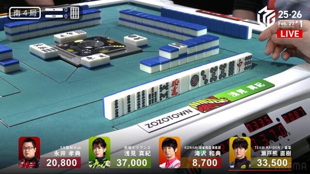 そして迎えたオーラス。親は瀬戸熊。永井と滝沢は、着順アップには跳満ツモが必要な状況。対して、アガリトップの浅見は、なんとかこのまま逃げ切りたいところだ。
