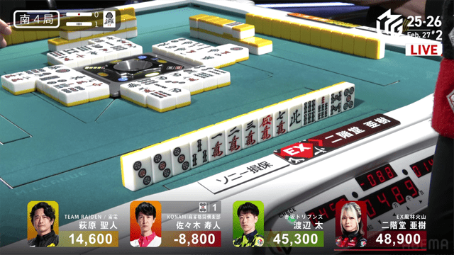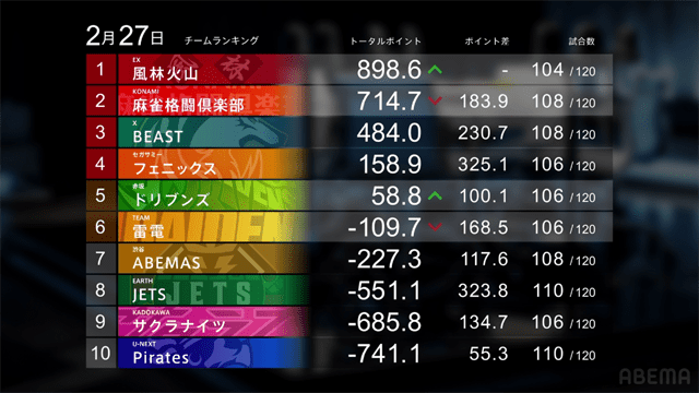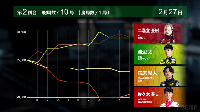 2月に入りポイントを減らし、2位の麻雀格闘倶楽部に迫られていた風林火山だが、選手兼監督である亜樹が勝利を挙げ、再び差を拡げた。