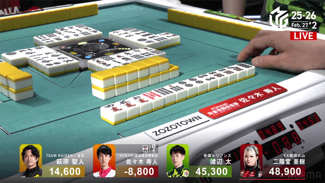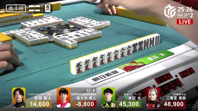 太がポンの発声をするが、同時に寿人がロンと発声、2600は2900のアガリとなった。