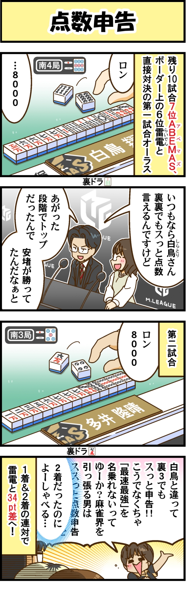 【Mリーグ2025-26】渋谷ABEMAS、6位雷電とのボーダー争いに勝利し、ますます接戦に!!【Mリーグほぼ毎日4コマ】藤島じゅん/VOL.1058