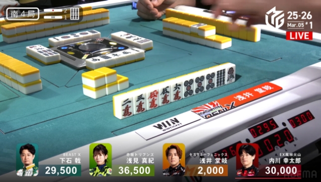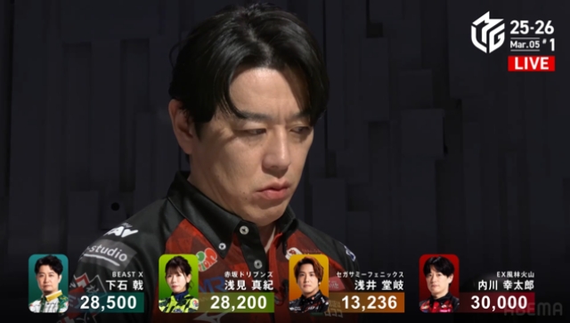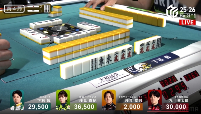 下石は1000・2000の和了で逆手トップに、浅見は堂岐に満貫が打てないという条件で