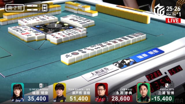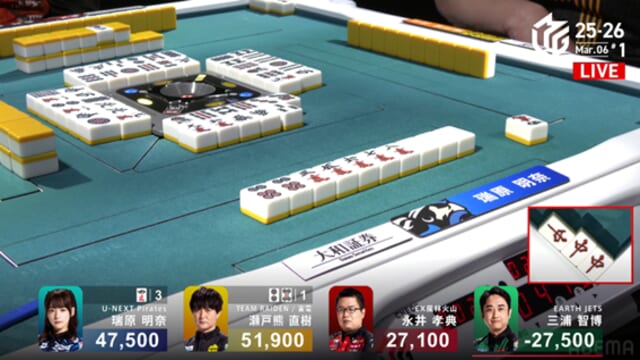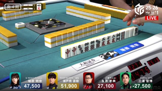 をキャッチ。たった3局で42,900点を失う目を覆いたくなるような苦しい展開となった。