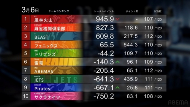 7位の渋谷ABEMASとの直接対決は残り1節(3月16日)、ひとつ上の赤坂ドリブンズとは3節(13日、20日、27日=レギュラー最終日)残っているが、本日はどちらのチームも卓上にはいない。
