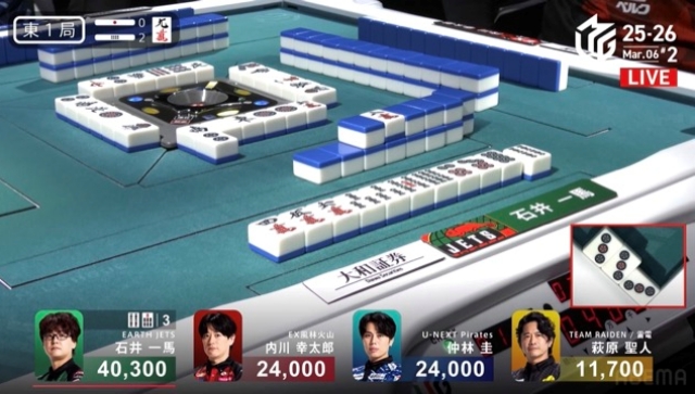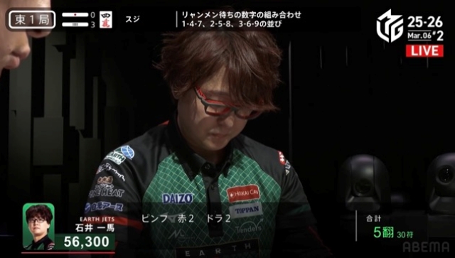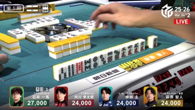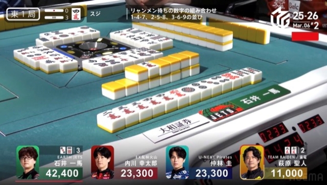 一馬の先制リーチを受けた萩原、ピンフドラ赤のイーシャンテンからまっすぐ