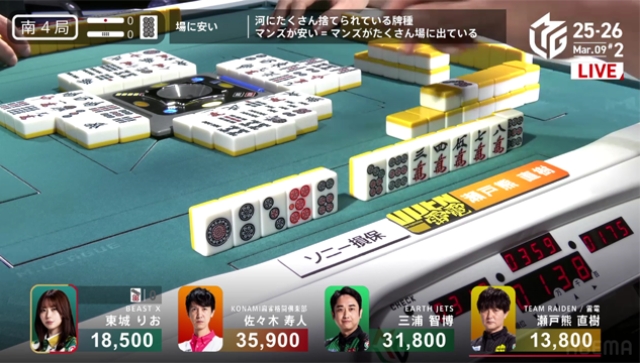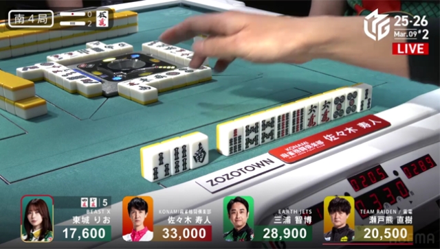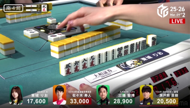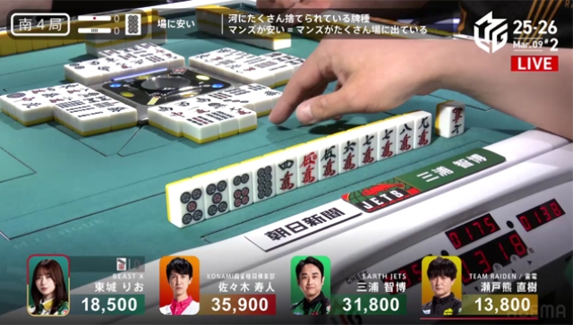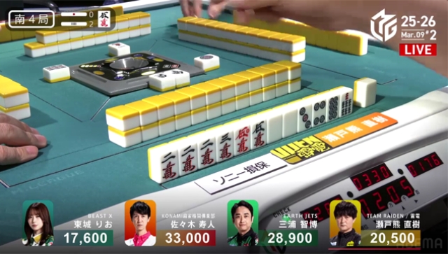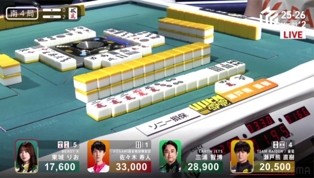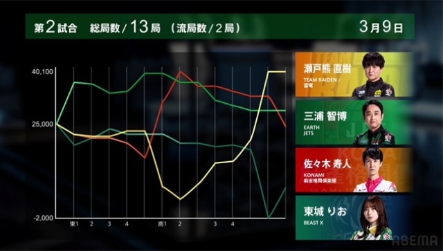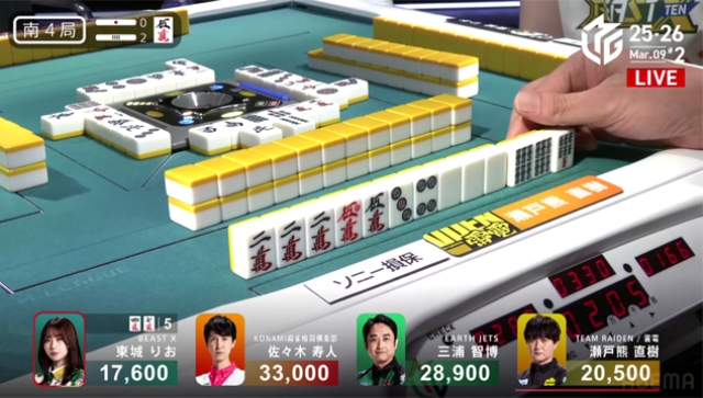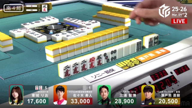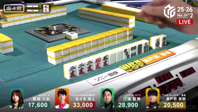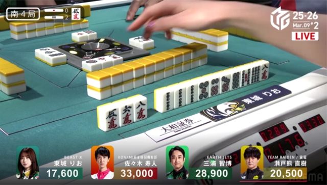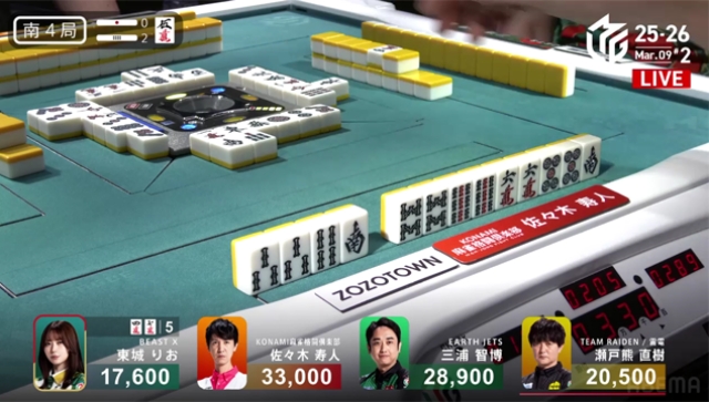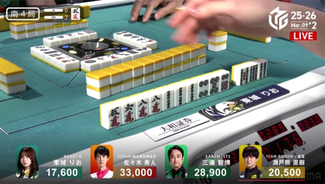 南4局3本場は、東城が素点回復の満貫を寿人から出アガりゲームセット。このアガリで、三浦は2着に浮上した。