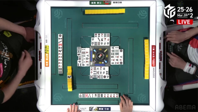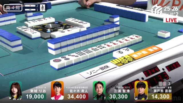 南4局1本場、トップ目は寿人の34400点だが、供託が2本出たことで各々が条件をクリアしやすくなった。