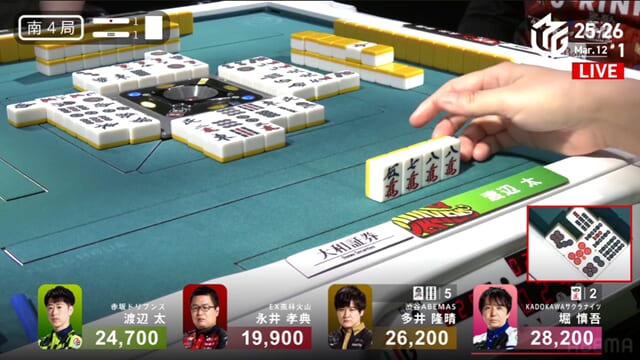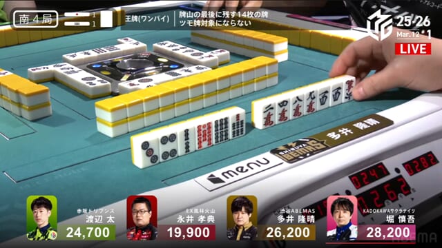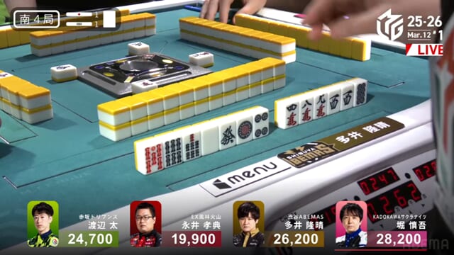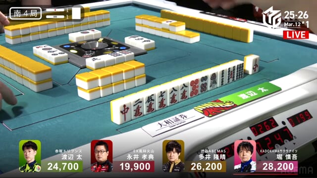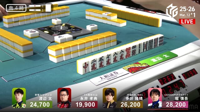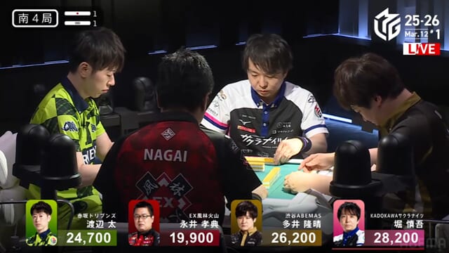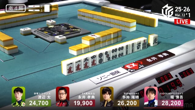 トップ目の堀は、親番のため一度大きな加点が必要。多井は供託と1本場があるためアガリトップ。 太はアガればライバルABEMASを逆転でき、トップまで届けばなお大きい。そして個人タイトルがかかる永井は、ラス回避と1300-2600でのトップ、両方を視野に入れる。