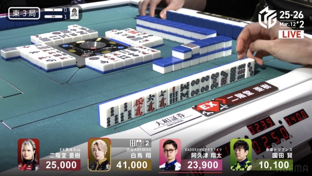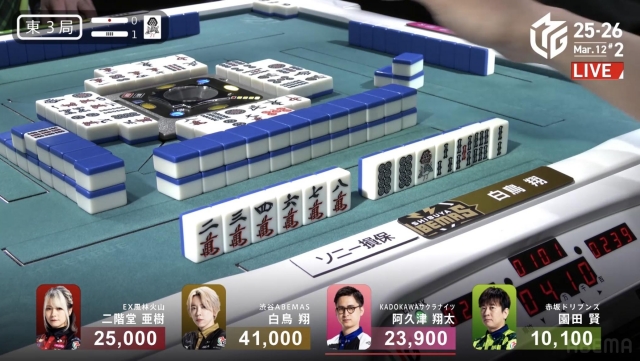 東3局1本場は、下家にいる阿久津のホンイツ仕掛けを、白鳥が、