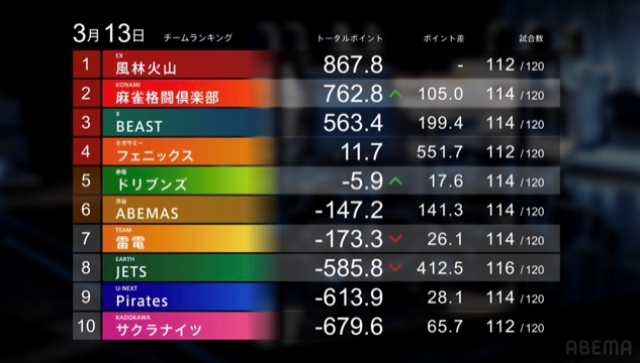 本日のゲームを終えて、ボーダー争いはABEMASと雷電の一騎打ちの様相になった。