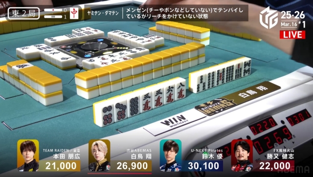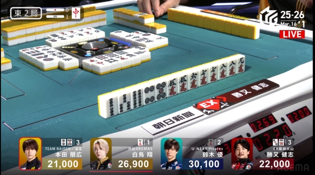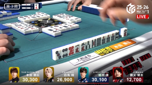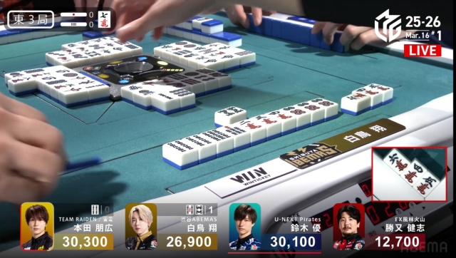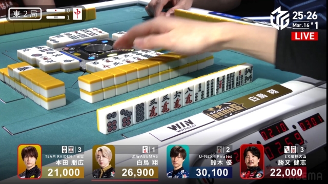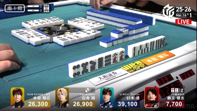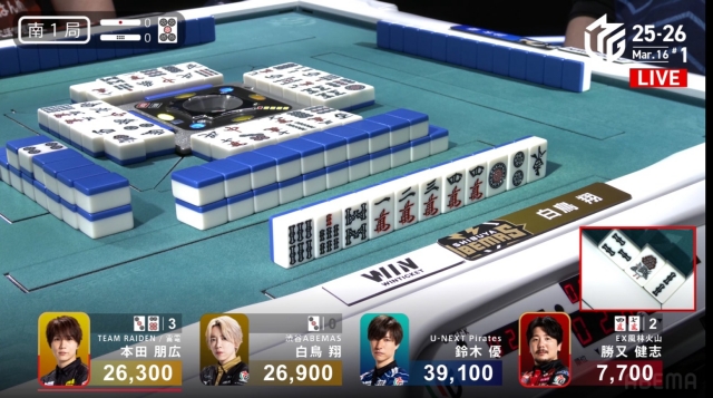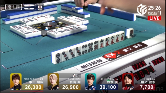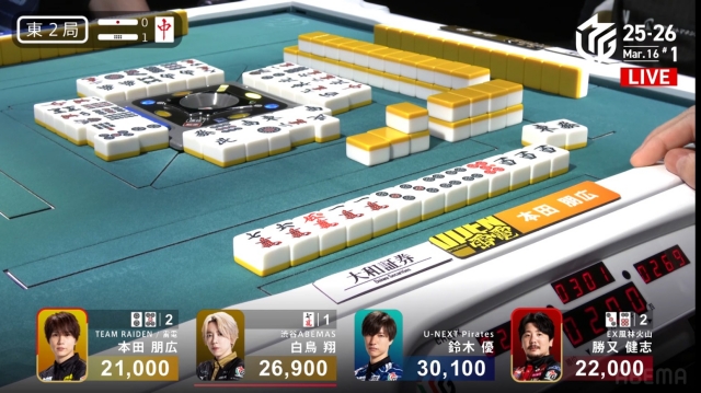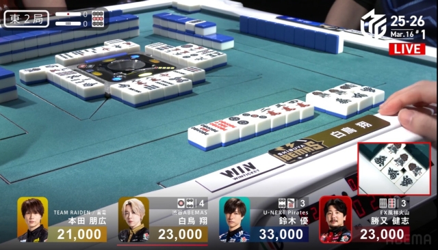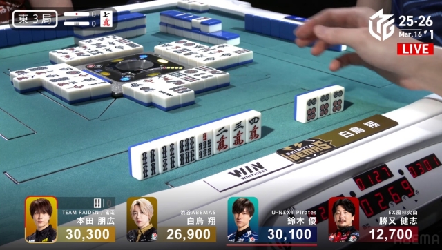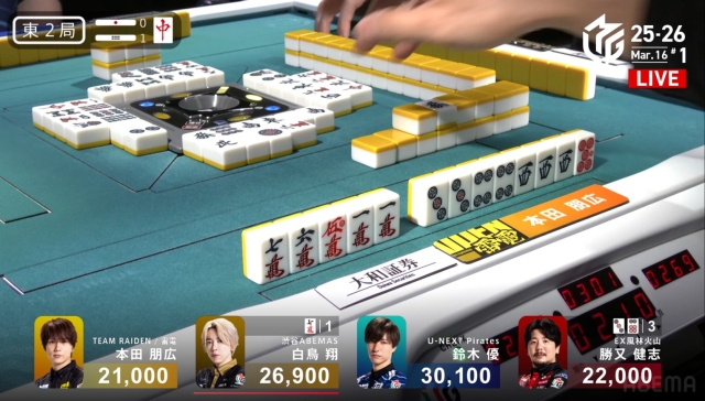 勝又がピンフドラ1のリーチを打つと、呼応するように本田にもテンパイ。
