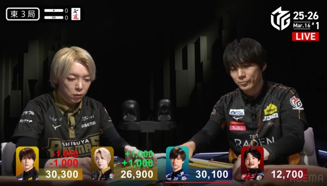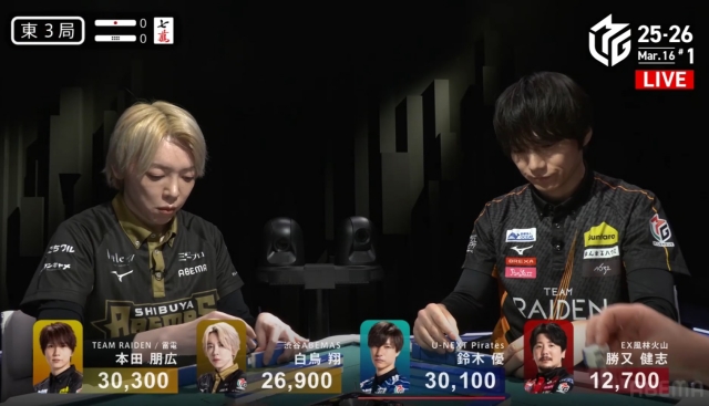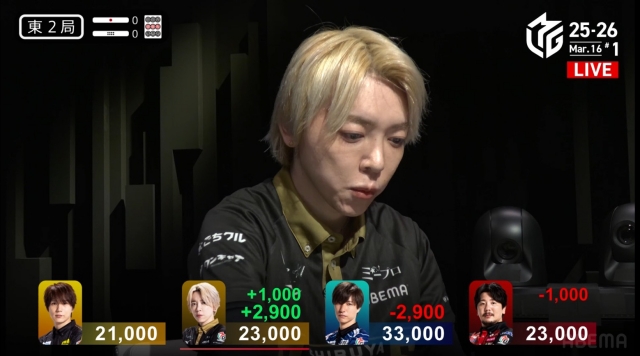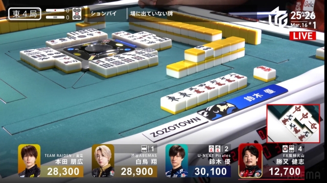 東4局に優が2000、4000をツモアガったことで、3人競りの状態から一歩抜け出した。