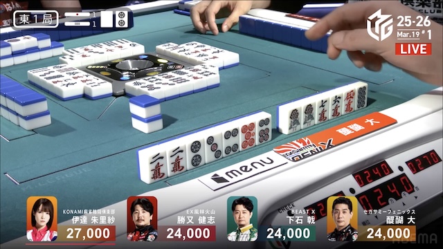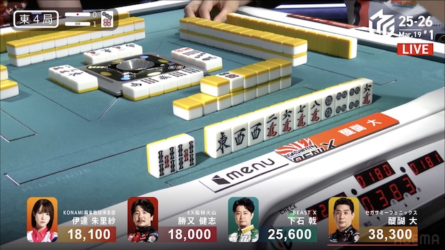 を残してテンパイで振り込んでしまいました。おそらく、下石さんのアグレッシブな雰囲気に押されたんじゃないですかね。平面で見れば絶対に親をマークすべき局面で、出だしがよくない感じがしました。