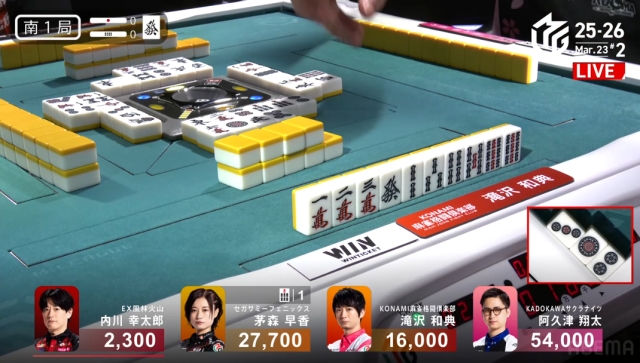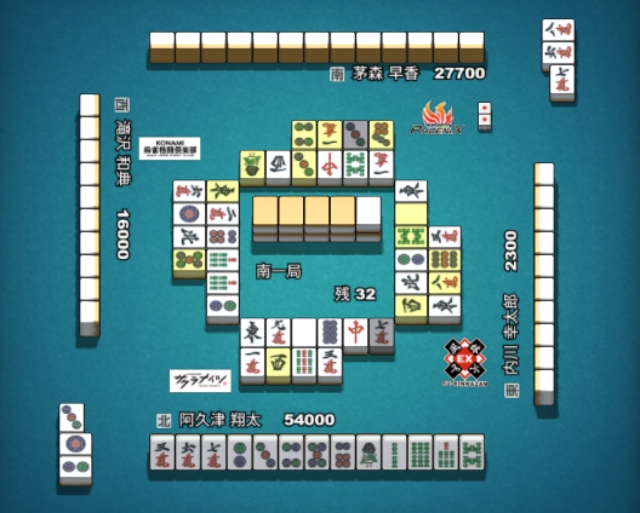 54000持ちで迎えた南場、阿久津は三面張両面のイーシャンテンを取らなかった。