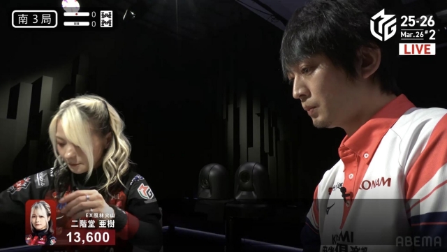 牌の巡り合わせに助けられ、亜樹が300-500のアガリを決める。