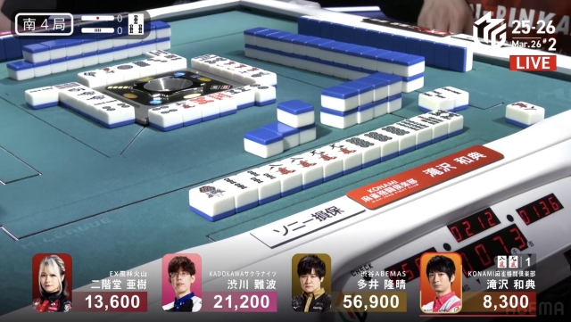 親番の滝沢が、リーチツモ赤の2000オールをアガって、